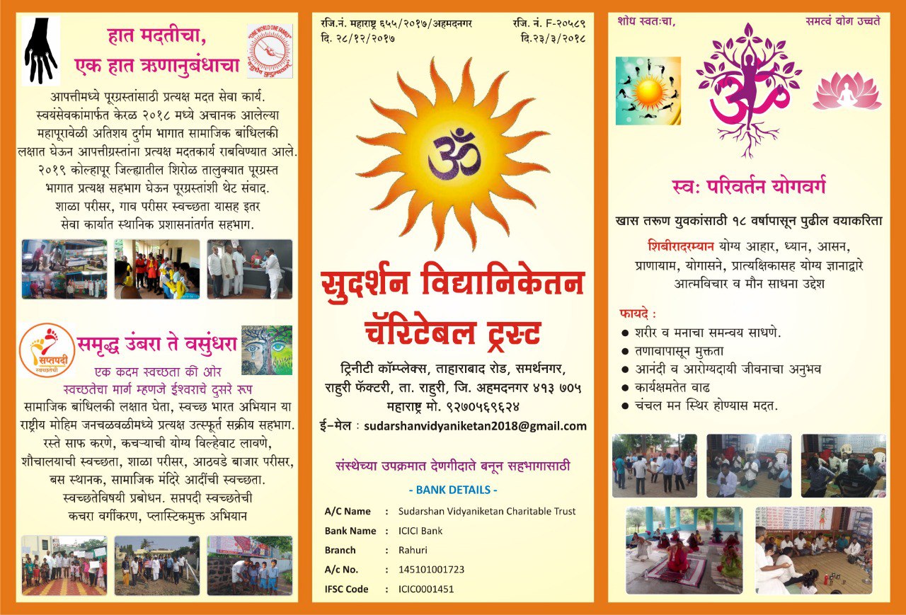 Sudarshan Vidyaniketan charitable Trust, Lakshmibai kunkulol sankul, Ving B, Flat-no.2, Kolhar BK, Tal.: Rahata, Dist.: Ahilyanagar, Maharshtra- 413 710.